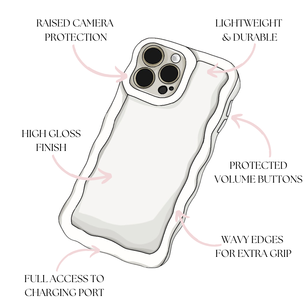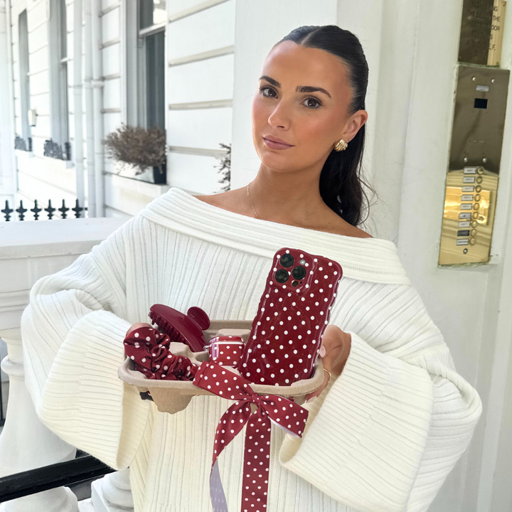 Playful yet chic, the Wavy Phone Case in Burgundy Polka Dot is a classic with a twist.