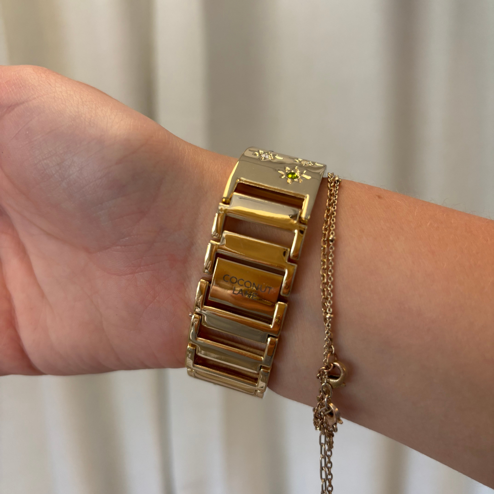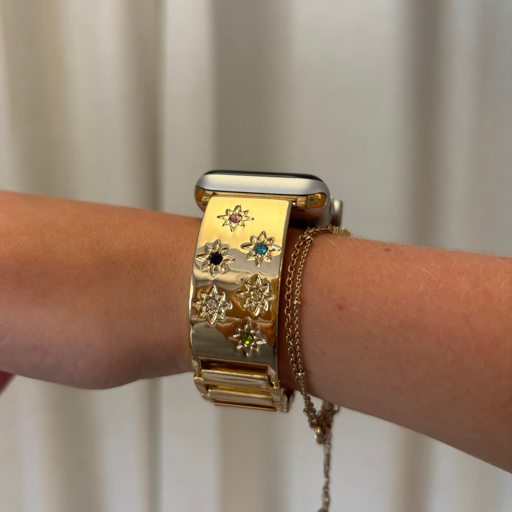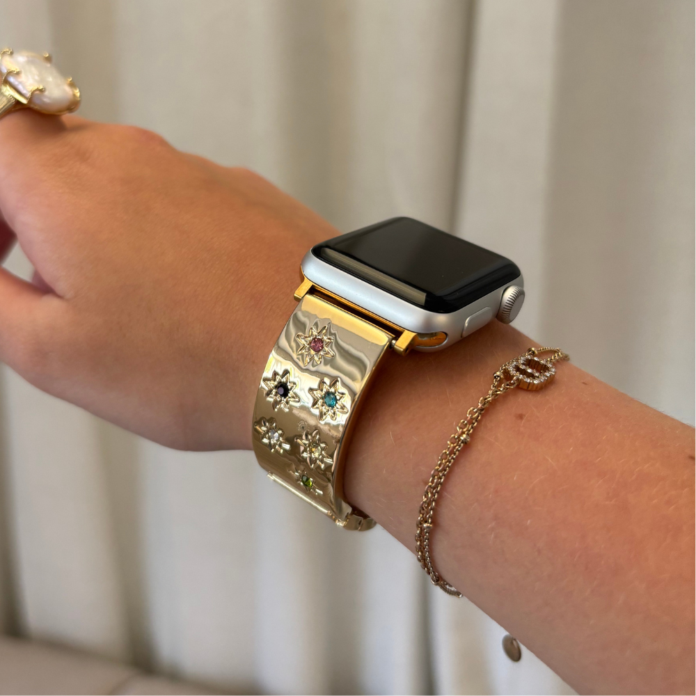 Bring some dreamy, sun-kissed sparkle to your wrist with our Ibiza Coloured Stone Apple Watch Strap in Gold. Designed for the girls who love their accessories sweet, stylish, and just a little bit magical, this strap is dotted with delicate coloured stones that shimmer like a summer sunset on the beach. 💫🌸
