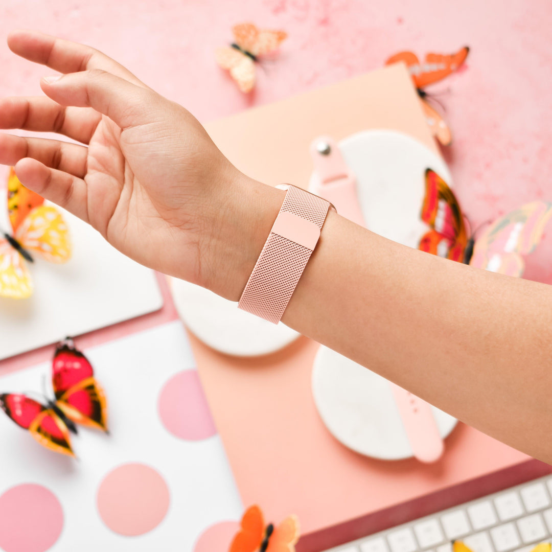 A hand wearing a Coral Pink Magnetic Chain Apple Watch Strap by Coconut Lane. The background includes colorful butterfly decorations, a pink polka dot notebook, another pink Apple Watch strap, and a portion of a keyboard. The scene is set against a soft pink surface.