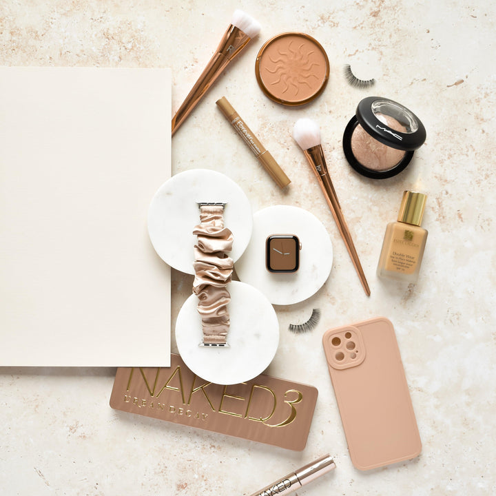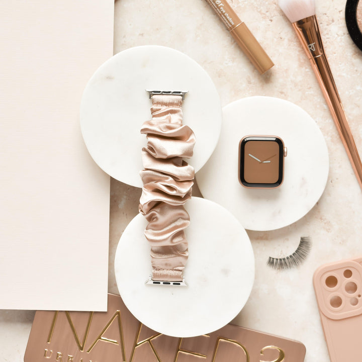 Beige-Satin-Scrunchie-Apple-Watch-Strap-Band-Flat-Lay