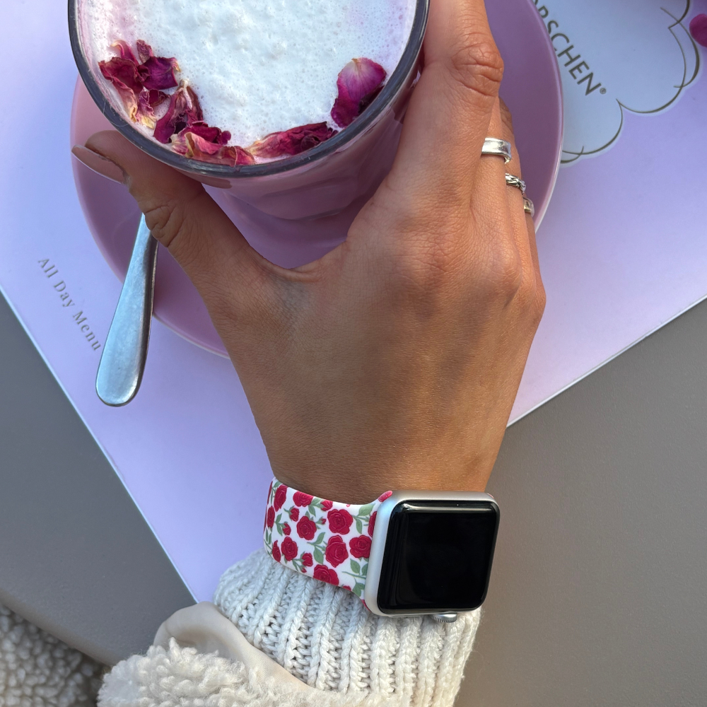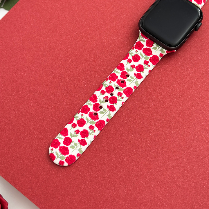 The flower of love - why not buy your own Roses in the form of our dreamy Apple Watch Strap  🌹 Made of durable silicone, it features delicate crimson roses that will make you feel so on trend.