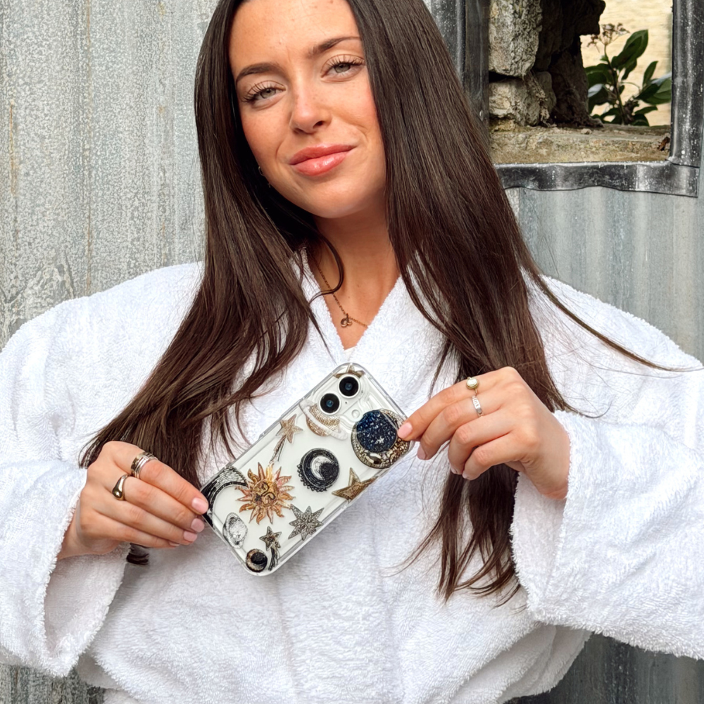 Girl holding both celestial and pastel celestial phone case wearing dressing gown