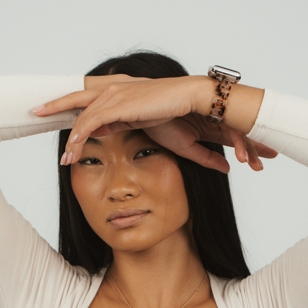 Timeless style meets modern sophistication with the Slim Luxe Ivory Tort Apple Watch Strap. Designed with a chic ivory tortoiseshell pattern and a slim silhouette, this strap brings effortless elegance to your wrist while keeping things light and comfy.