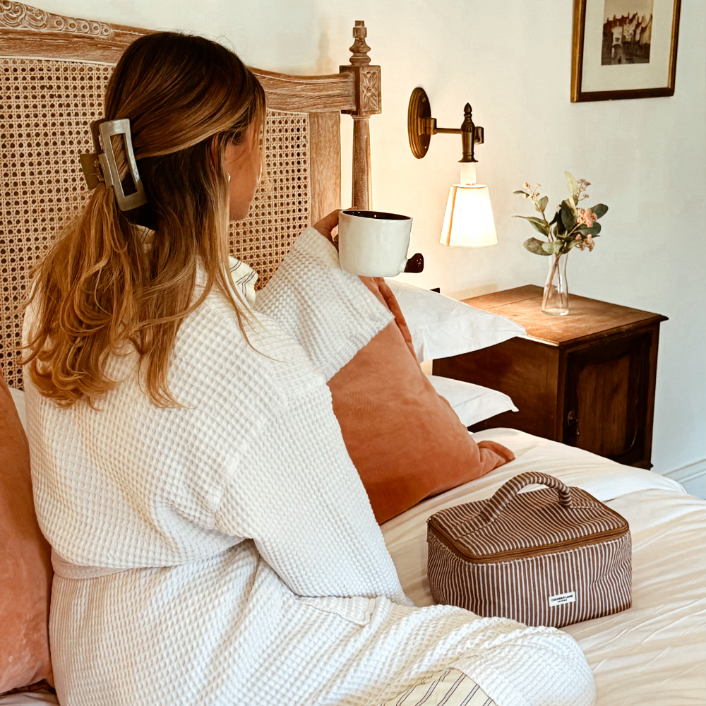 Meet your new travel essential. Designed for weekend escapes, long-haul adventures, and everything in between, the Travel Towel Vanity Case in Chestnut Stripes keeps your beauty routine perfectly organised wherever you go.